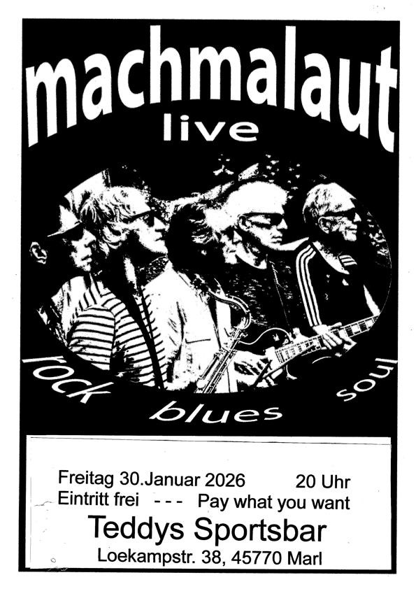MACHMALAUT – das musikalische Urgestein der Recklinghäuser Szene! Authentisch, sympathisch und ohne Starallüren überzeugt diese Coverband mit einem energiegeladenen Programm, das keinen Wunsch offenlässt. Von Rock und Pop über Soul und Funk bis hin zu Blues – hier trifft Abwechslung auf Qualität, und der Rhythmus geht sofort ins Blut!